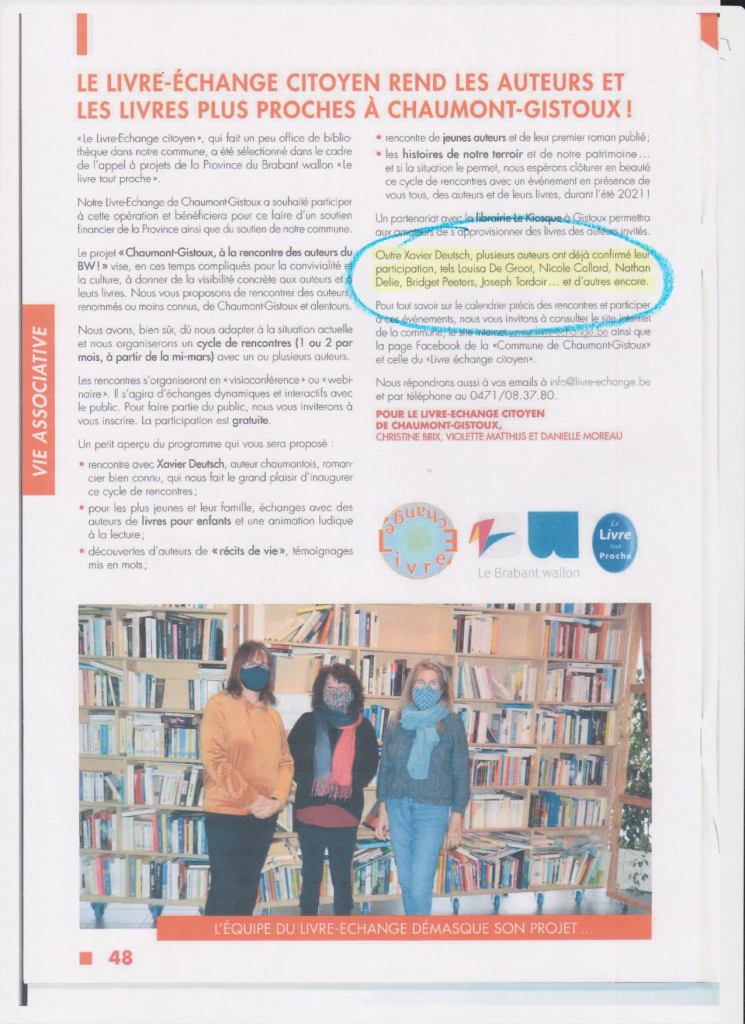 Dans le cadre du « Livre-échange citoyen » en partenariat avec la commune de Chaumont-Gistoux, « LE LIVRE TOUT PROCHE » de la Province du Brabant wallon organise une rencontre (via visio-conférence) avec Nicole Collard, ce jeudi 3 juin 2021 à 20 heures.